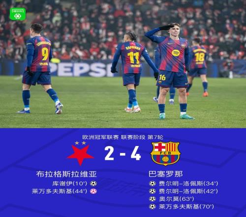 布拉格斯拉维亚对阵巴萨半场2球,与前6轮欧冠进球数持平